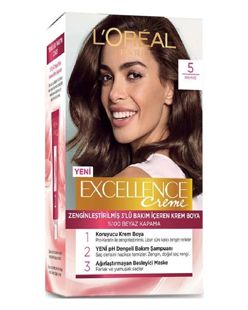 L'Oréal Paris Excellence Crème 5 Kahve, saçlara doğal ve zengin bir kahverengi tonu kazandıran kalıcı bir saç boyasıdır. Beyazları %100 oranında kapama sağlar ve uzun süre kalıcı renk sunar. Formülünde bulunan Pro-Keratin, Seramid ve İyonene G sayesinde saçı boyarken besler, güçlendirir ve onarır. Ayrıca, pH dengeli bakım şampuanı ve parlaklık veren besleyici maske içeren 3’lü bakım rutiniyle saçı nemlendirir ve ışıltılı bir görünüm sağlar.