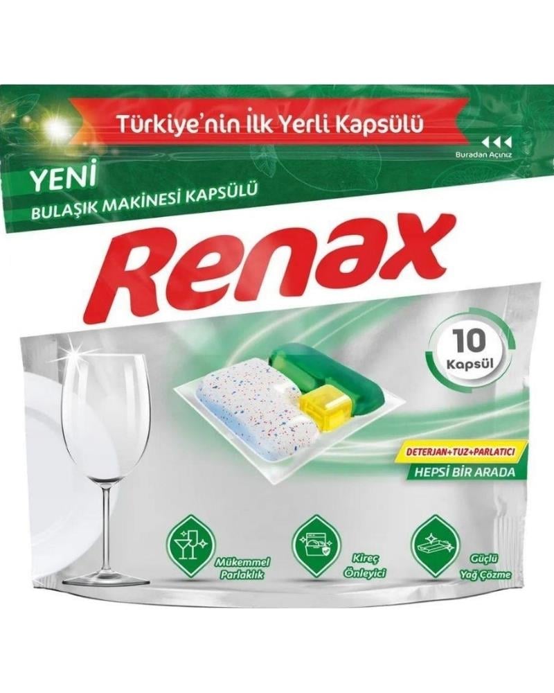 Türkiye’nin ilk yerli ve milli bulaşık makinesi kapsülü olan Renax Kapsül, Türkiye\'nin gurur kaynağı olup, mutfaklarınızda hem kaliteyi hem de milli üretimi desteklemenin keyfini yaşatır.; Bulaşıklarınıza etkili temizlik ve parlaklık sunan Renax kapsül, zamanınızı ve enerjinizi tasarruf etmenize yardımcı olur.; Bulaşıklarınızın daha uzun ömürlü ve hijyenik olmasını sağlamak için güvenle tercih edebilirsiniz.;