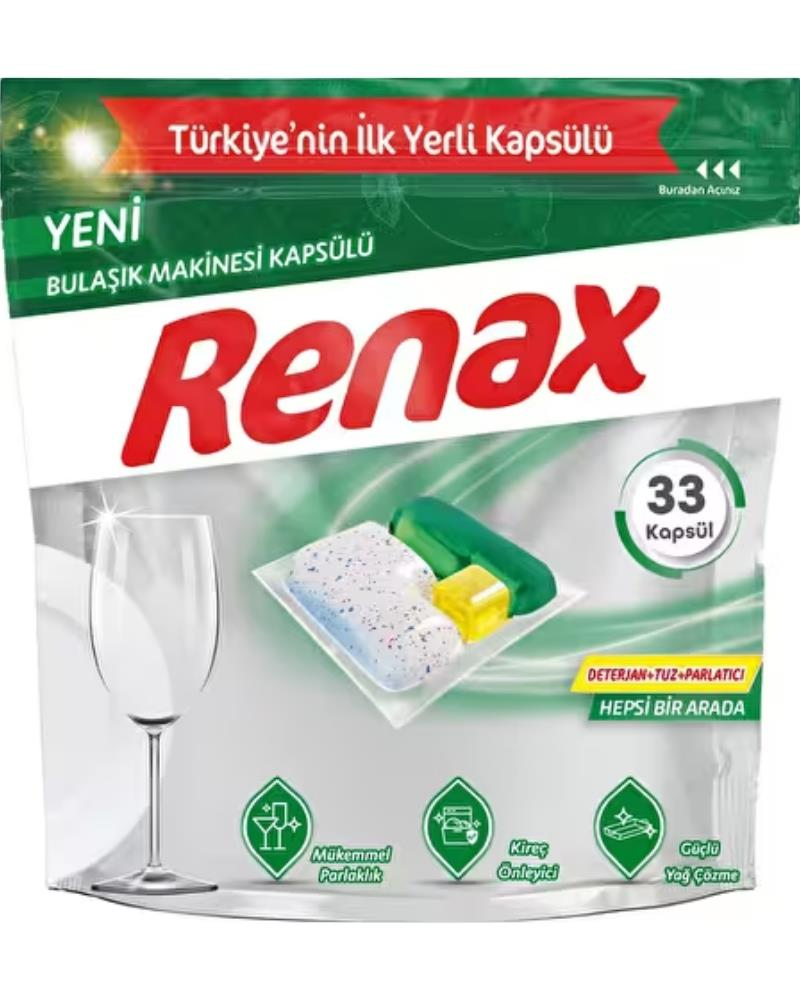 Türkiye\'nin ilk yerli ve milli bulaşık makinesi kapsülü ile tanışın! Parlaklık, kireç önleyici ve güçlü yağ çözme özelliklerine sahip Renax Bulaşık Makinesi Kapsülü, bulaşıklarınızın temiz ve parlak olmasını sağlar.; İçeriğinde deterjan, tuz ve parlatıcının hepsini bir arada bulunduran bu yenilikçi ürün, bulaşıklarınızın üzerinde biriken kireci önler ve su lekelerini yok eder.;
